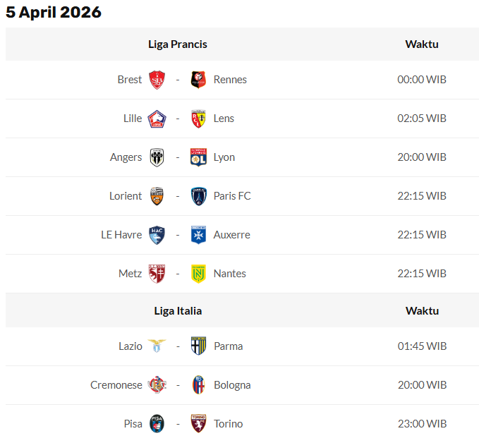 PERTANDINGAN BOLA Update Jadwal Pertandingan Bola 4 April 2026 April 4, 2026 Jadwal Pertandingan Hari Ini ter-Update tanggal 4 April 2026